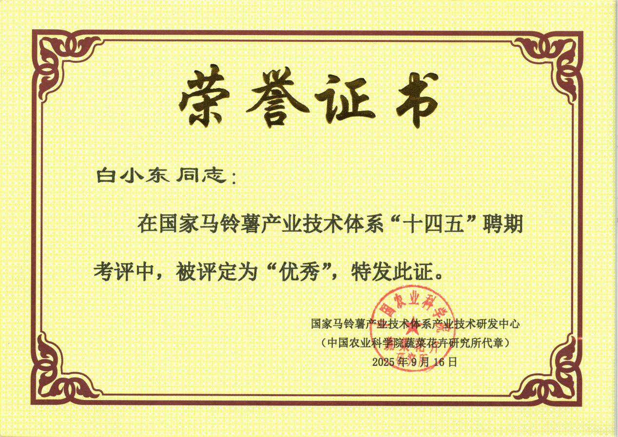 近日,国家马铃薯产业技术体系“十四五”聘期考评结果公布,我校白小东研究员凭借出色的业务能力与扎实的工作作风,在此次考评中被评定为“优秀”,其工作成果获得体系专家们的一致认可。