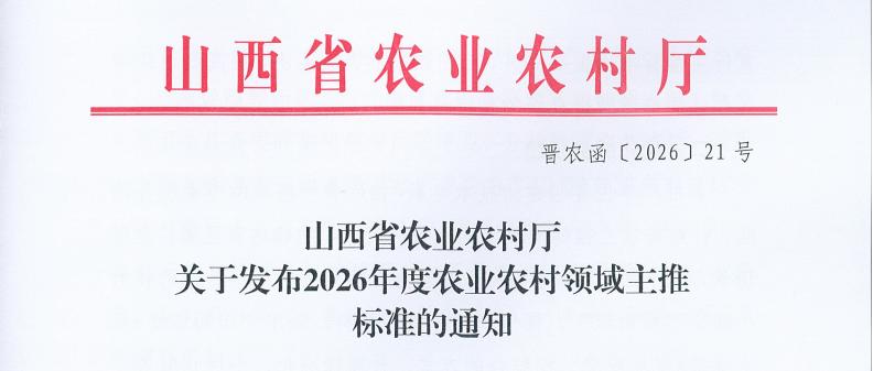 根据《山西省农业农村厅关于发布2026年度农业农村领域主推标准的通知》(晋农函〔2026〕21号),为深入贯彻落实《国家标准化发展纲要》,一体推进农业标准制定、应用、管理,充分发挥标准化在规范农业生产行业、提升农产品质量、引领产业升级中的基础性保障性作用,省农业农村厅经推荐遴选,确定了山西省2026年度农业农村领域主推标准50项,推广期为两年。
