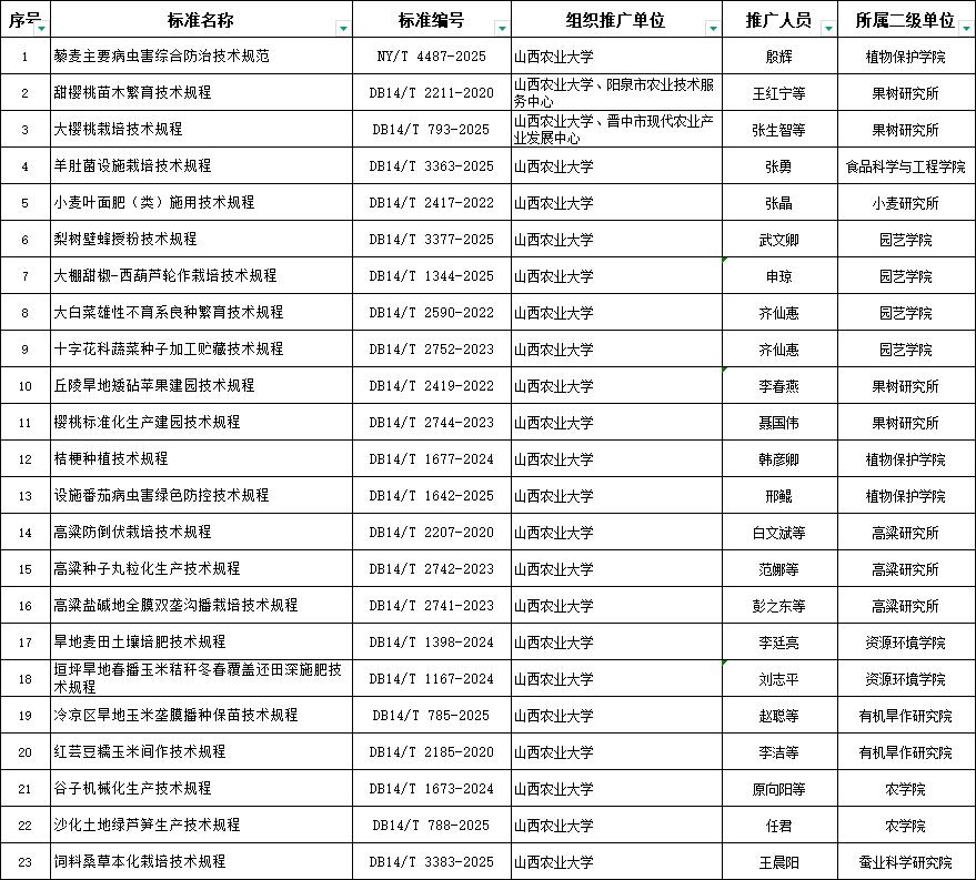 近日,省农业农村厅发布了山西省2026年度农业农村领域主推标准。我校(院)起草的23项标准入选,其中,行业标准1项、省级地方标准22项。