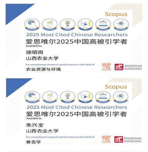 1月30日,全球信息分析公司爱思唯尔(Elsevier)正式发布2025“中国高被引学者”(Highly Cited Chinese Researchers)榜单。山西农业大学2位高层次人才入选。资源环境学院徐明岗院士作为“农业资源与环境”学科入选高被引学者榜单,动物医学学院朱兴全教授作为“兽医学”学科入选该榜单。其中,朱兴全教授已连续12年入选“中国高被引学者”榜单。